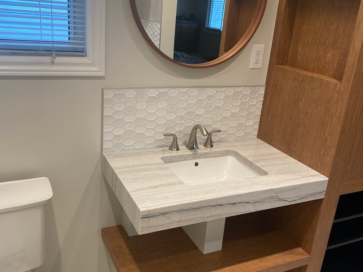 Modern Bathroom Makeover - Experience the perfect blend of elegance and functionality with our modern bathroom makeover. This transformation features warn wooden accent cabinetry built for the homeowner. Central to the design is a custom marble sink, meticulously crafted to offer both style and durability.